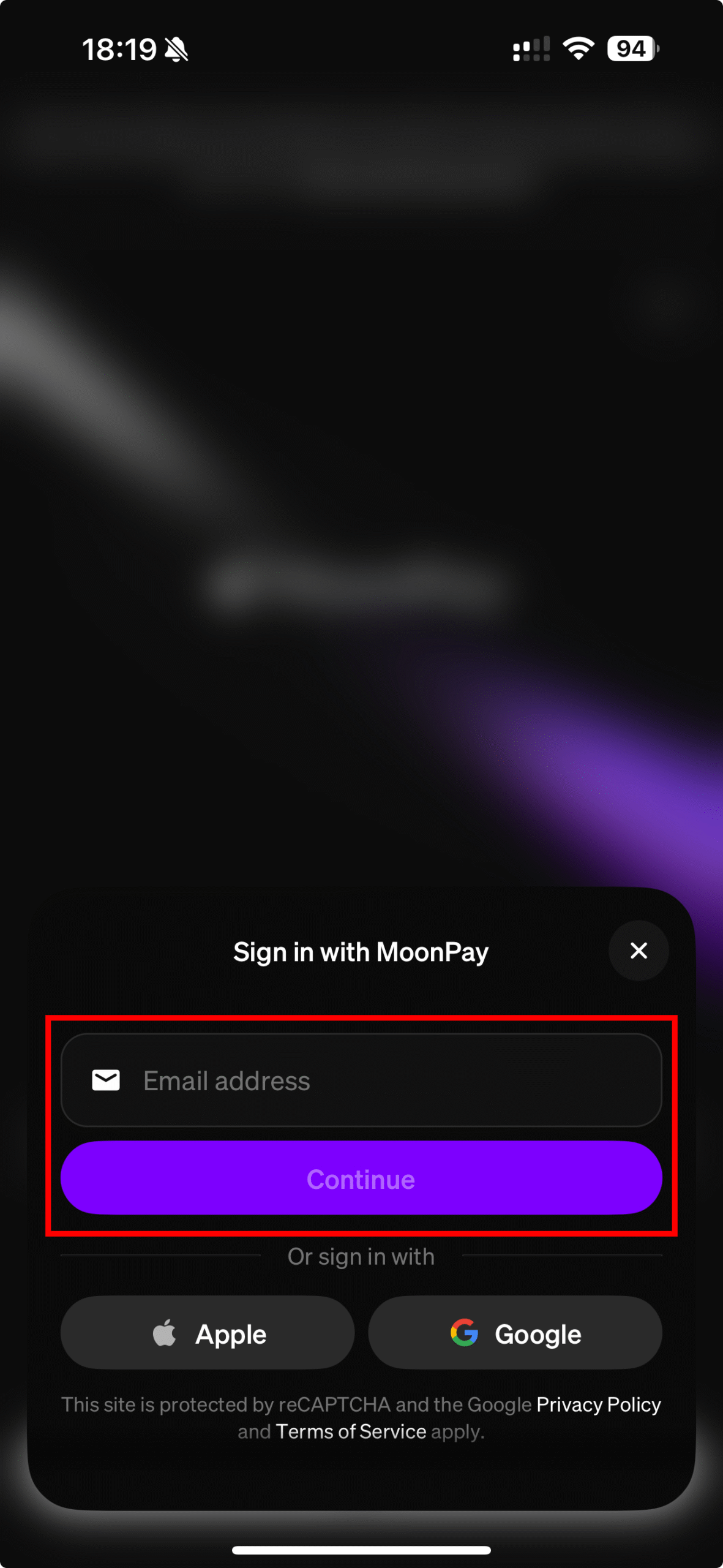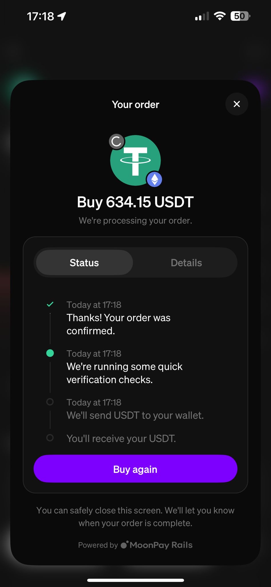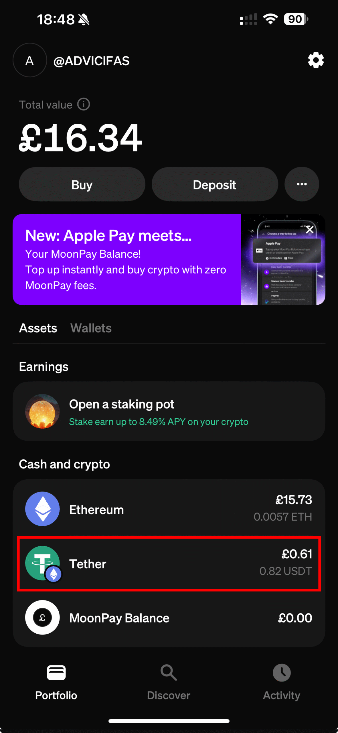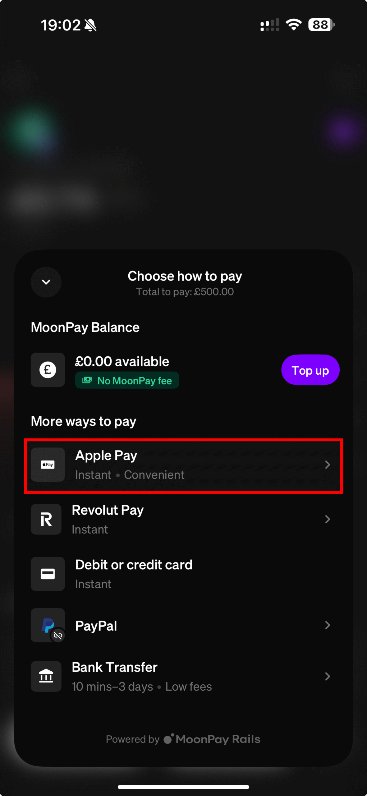 You solely log in using MoonPay and purchase USDT (ERC-20) to the value in GBP of your service cost using Apple or Google Pay.