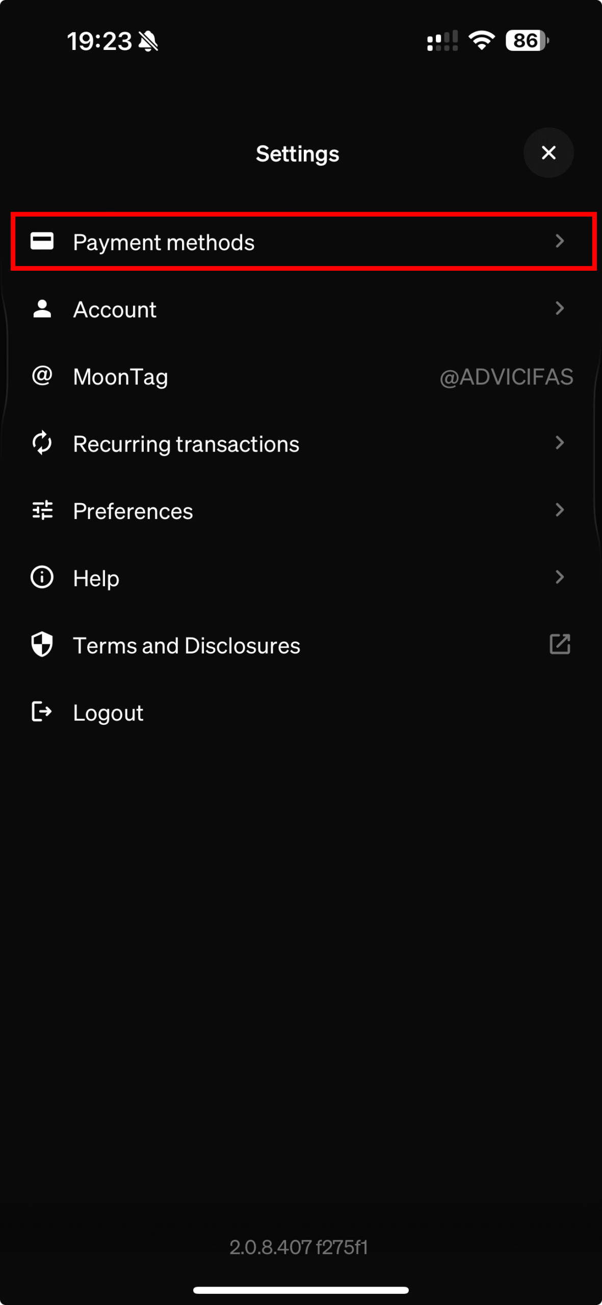 3. Press ‘Payment Methods‘ to display any stored payment methods.