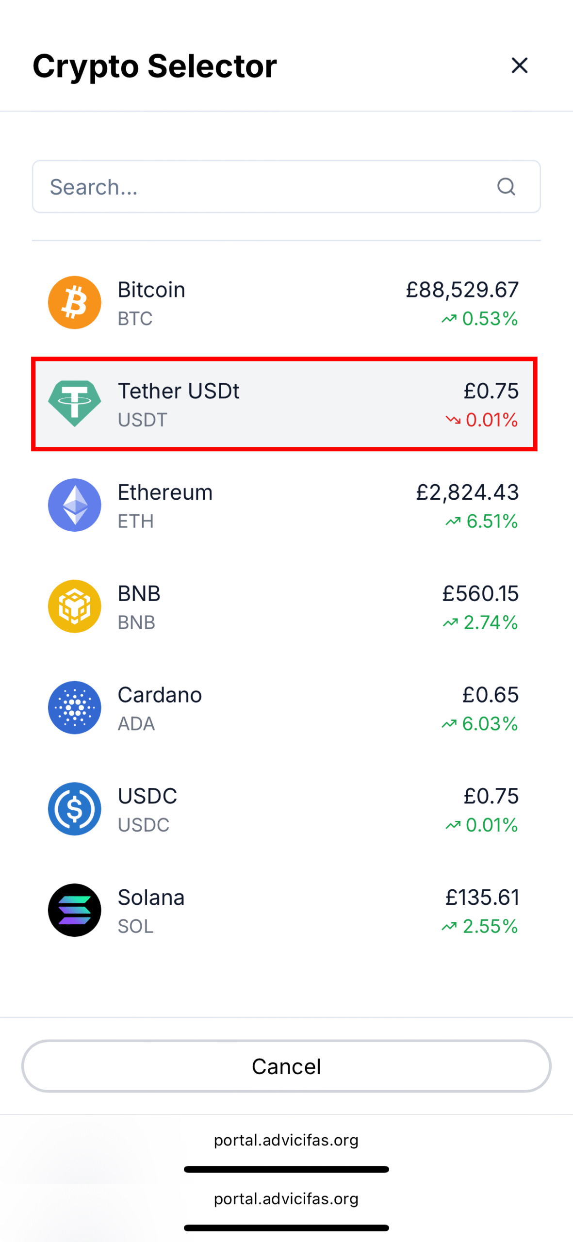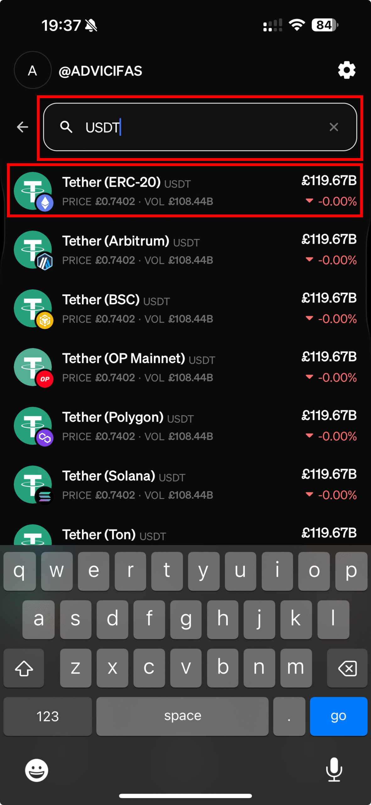 Type in ‘USDT‘, locate, and select ‘Tether (ERC-20)‘.