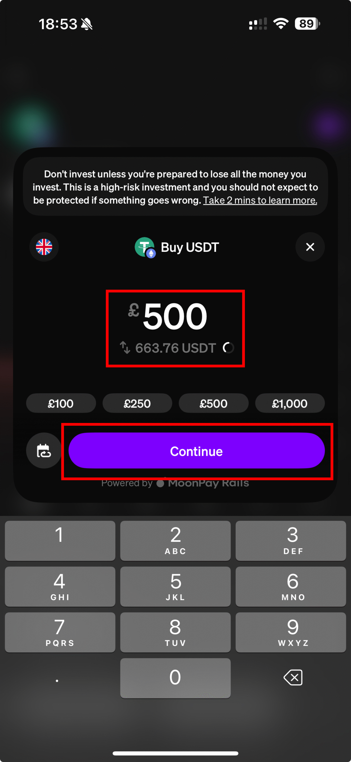 7. In the ‘Buy USDT‘ popup, enter in GBP the amount you need to pay (e.g. £500) and then press Continue.