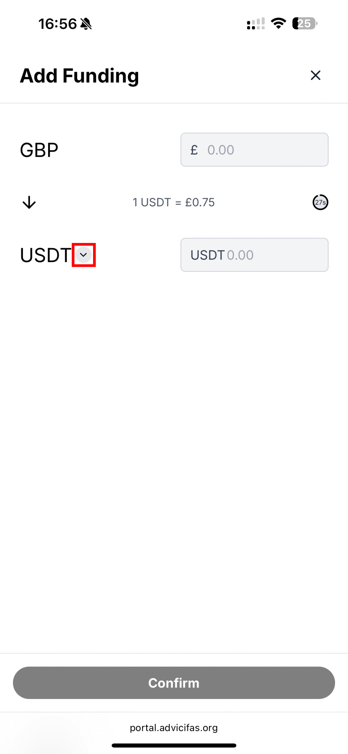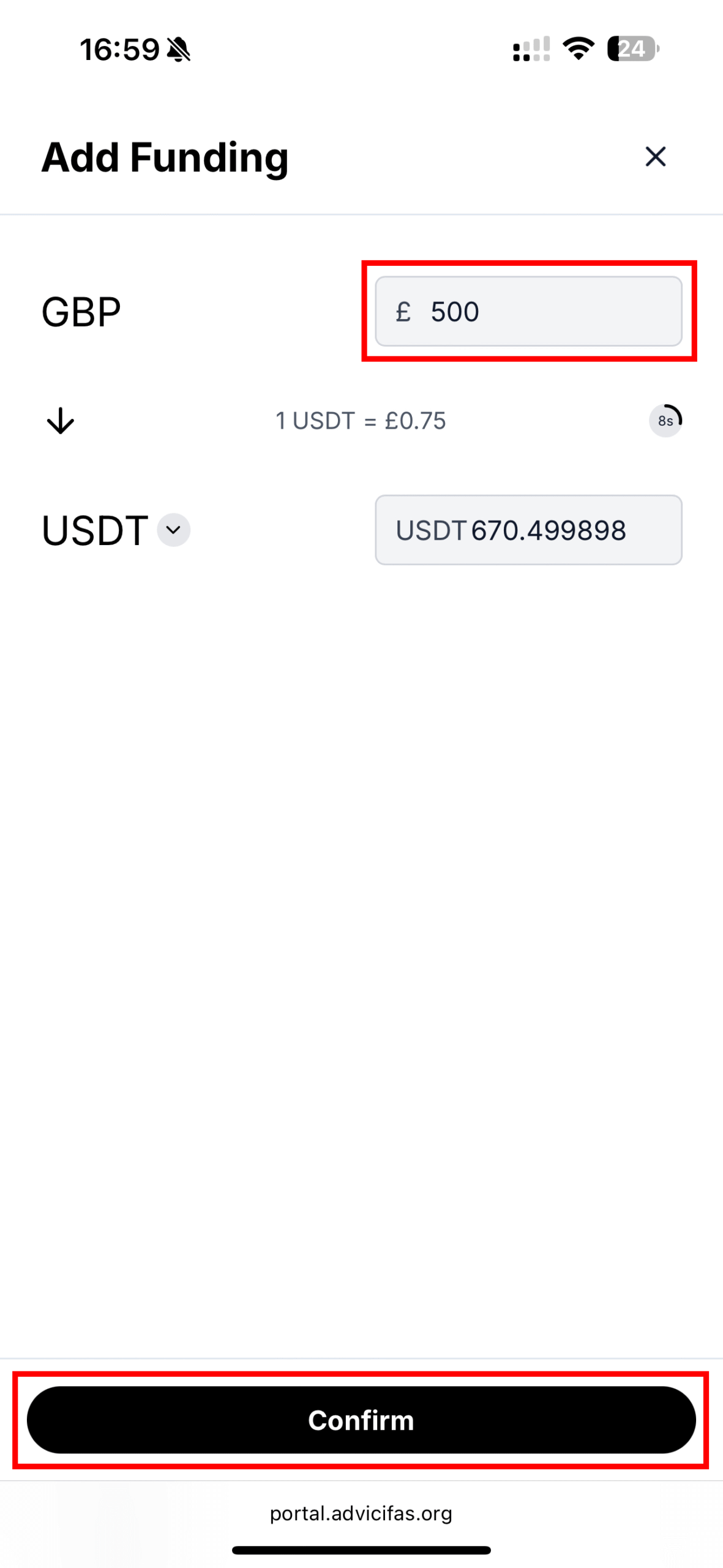 6. Back in the popup, enter the amount you wish to add in GBP and press Confirm.