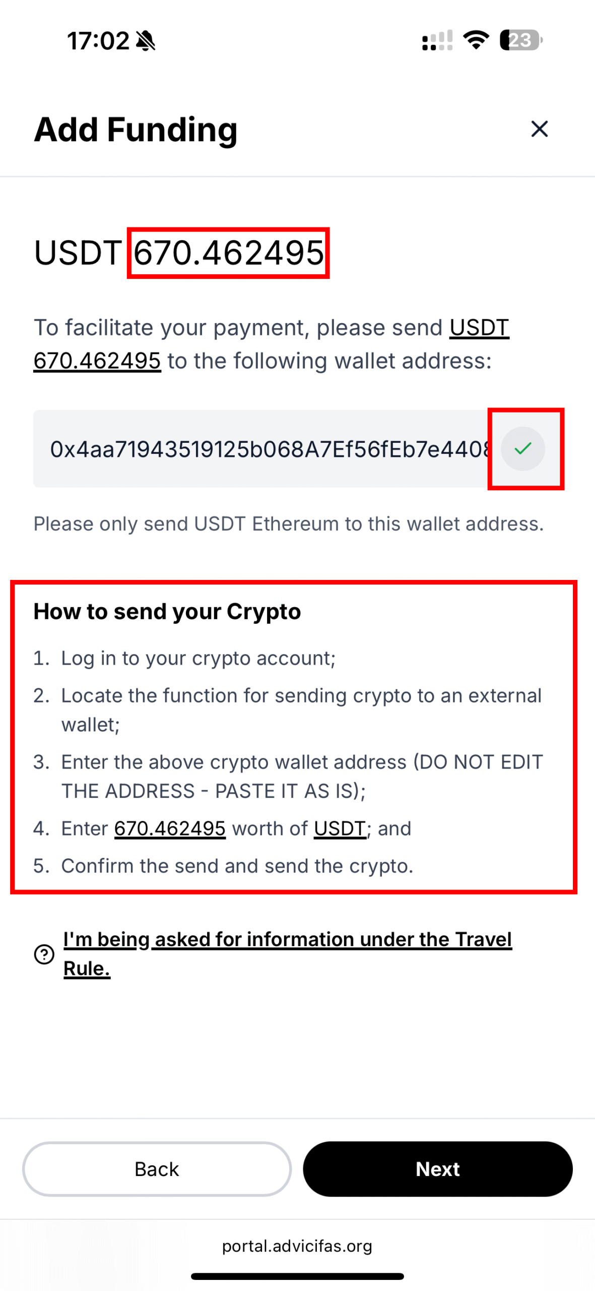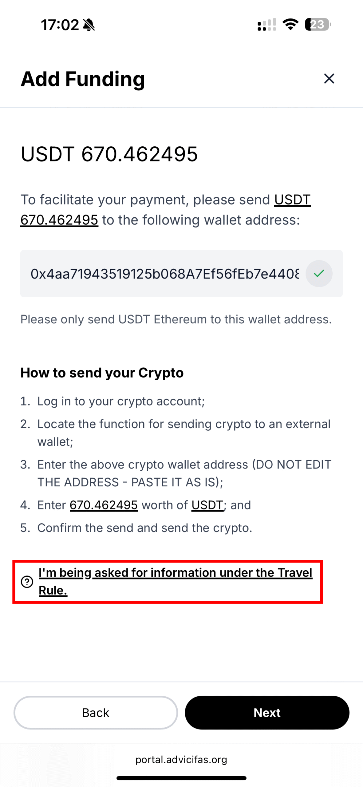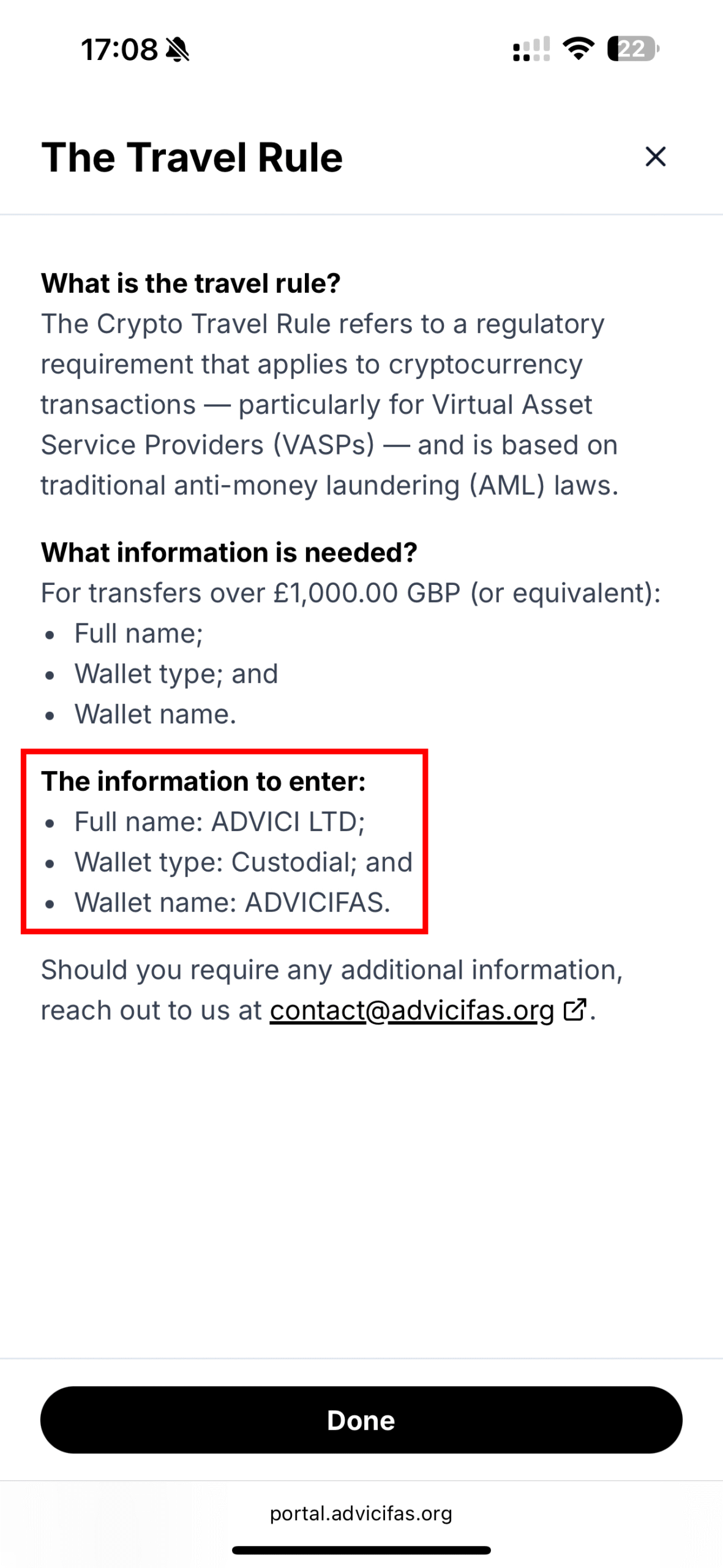 Note: You may be asked for information under the Travel Rule. In which press “I‘m being asked for information under the Travel Rule” and enter the information provided.