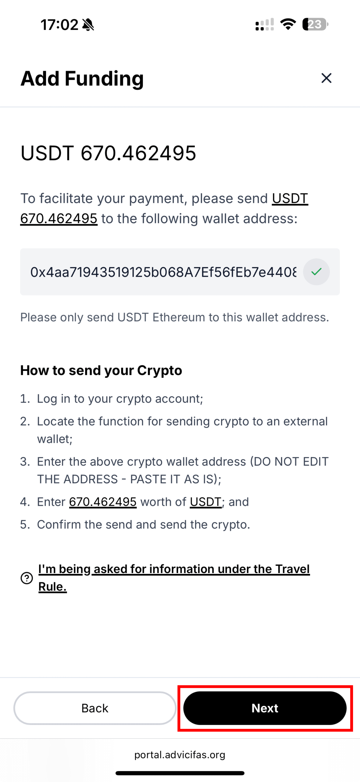 8. Upon submission of your transfer via your desired crypto wallet, press Next.