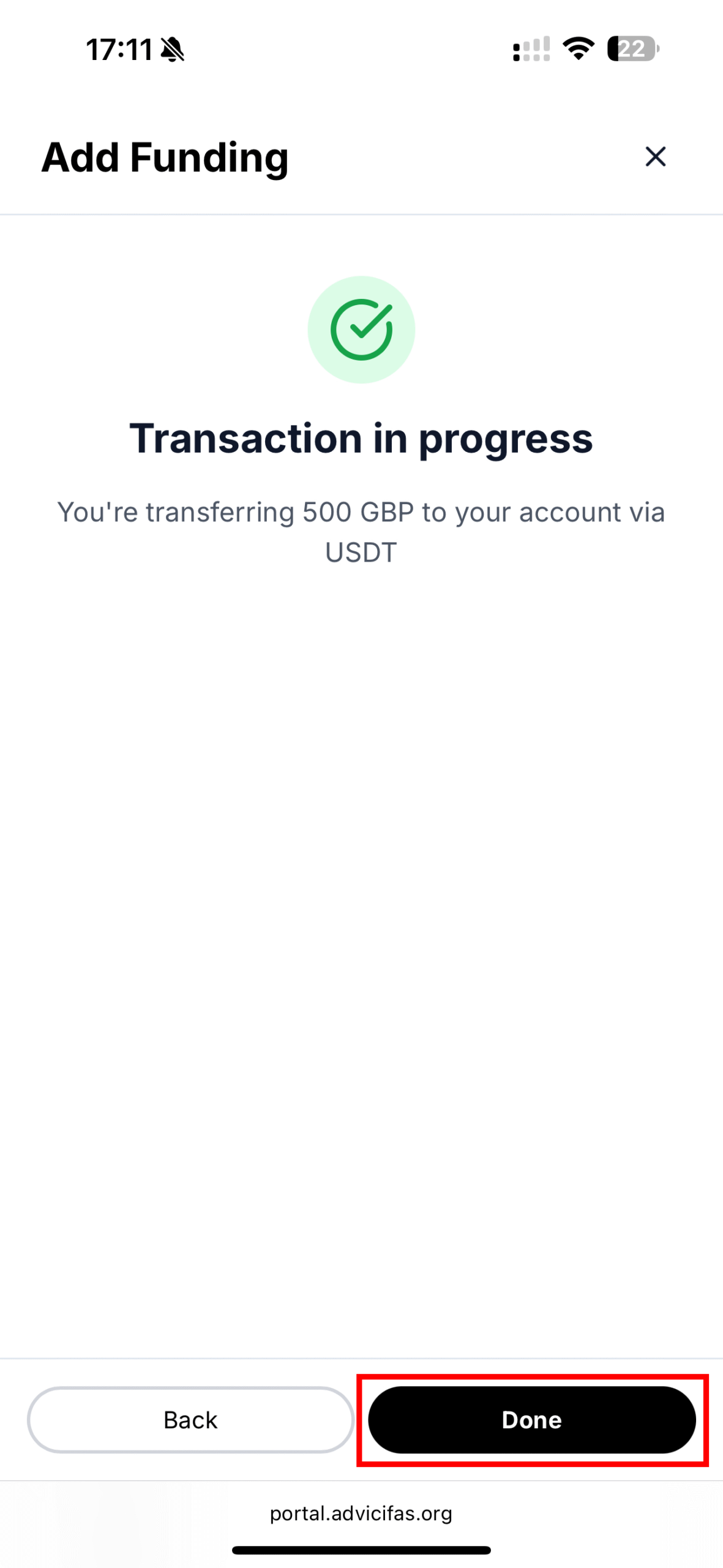 9. You will then see a “Transaction in progress” screen. Press Done to close the popup.